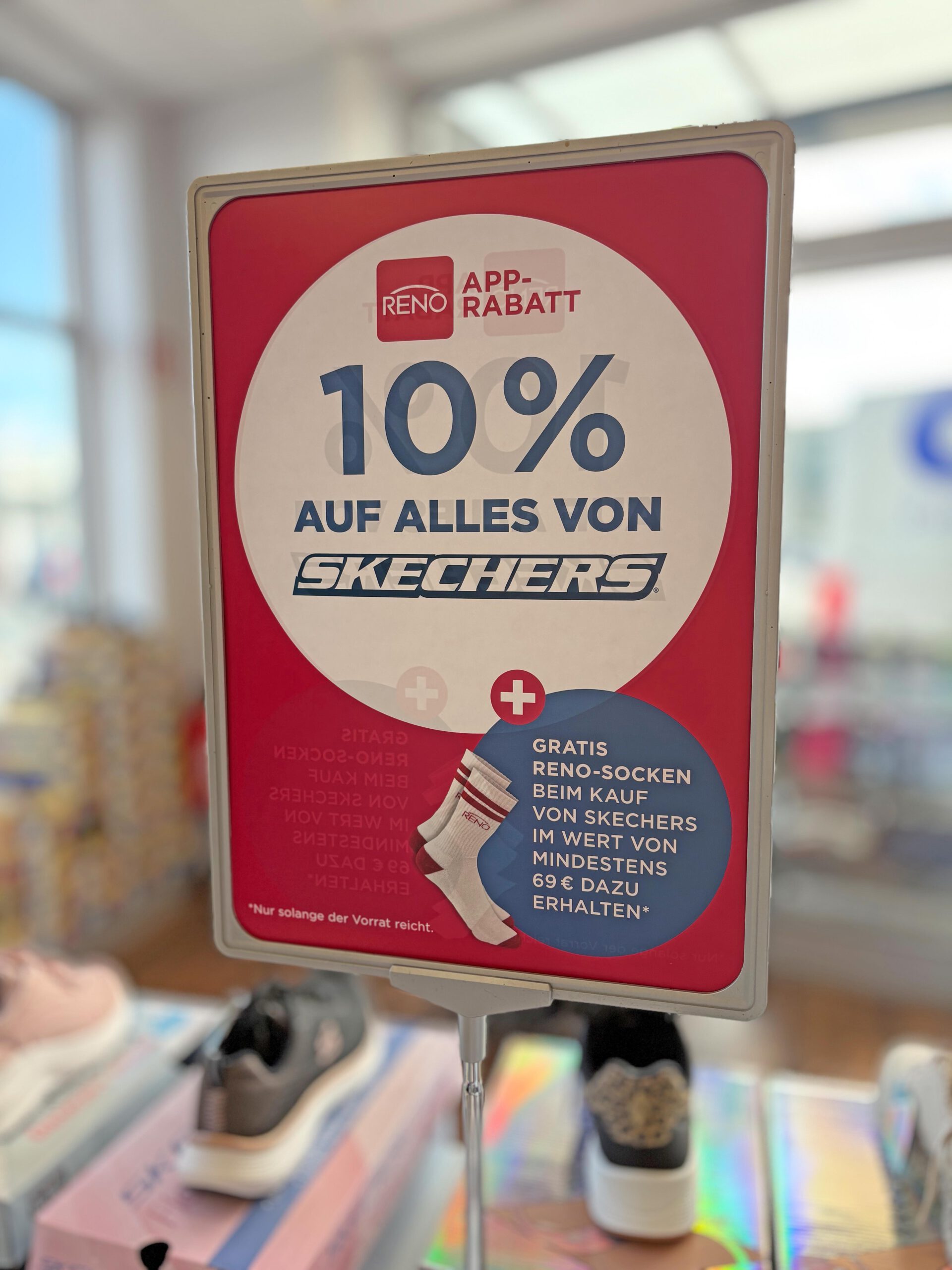 Extra-Bonus: Beim Kauf von Skechers Artikeln im Wert von mindestens 69 € erhältst du zusätzlich ein Paar RENO-Socken gratis dazu (nur solange der Vorrat reicht).
